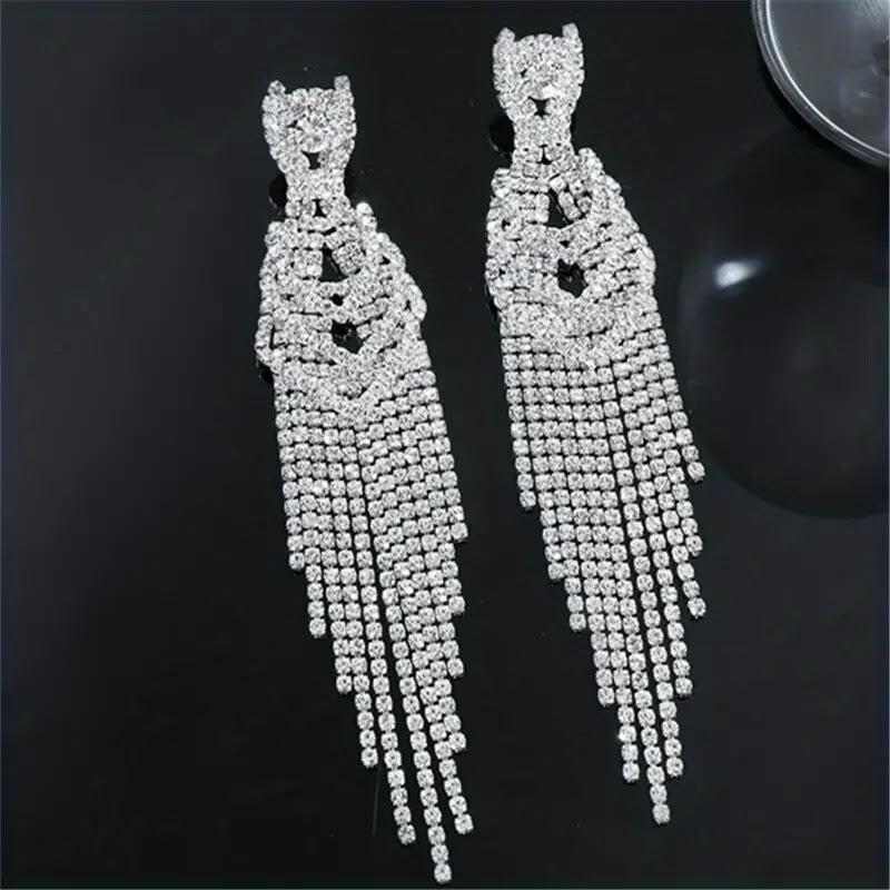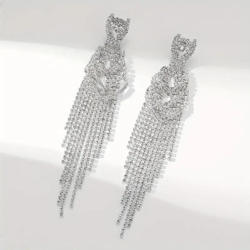 ラインストーンでデコレーションされたエレガントなタッセルピアス。華やかな装いにワンランクアップ。